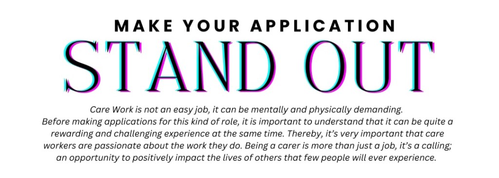 Before making applications for this kind of role, it is important to understand that it can be quite a rewarding and challenging experience at the same time. Thereby, it’s very important that care workers are passionate about the work they do. Being a carer is more than just a job, it’s a calling; an opportunity to positively impact the lives of others that few people will ever experience.